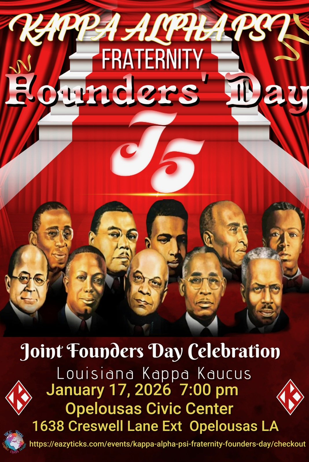 Statewide Founders’ Day Program Date: Saturday, January 17, 2026 Time: 7:00 PM Location: Opelousas Civic Center The program will be open to the public, and significant others are invited. The evening will include entertainment and a catered meal offering a choice of fish or chicken. Hotel Accommodations: Room blocks have been reserved at: Hampton Inn – Opelousas Evangeline Downs Casino & Hotel The deadline to register for the Founders’ Day event and secure hotel rooms at the group rate is January 2, 2026. Event Cost: Alumni Brothers: $75 Undergraduate Brothers: $50 Table: $600 seats 8 (suggested for chapters to purchase) Guests: Same price as the Brother attending Tickets and additional information are available online.
